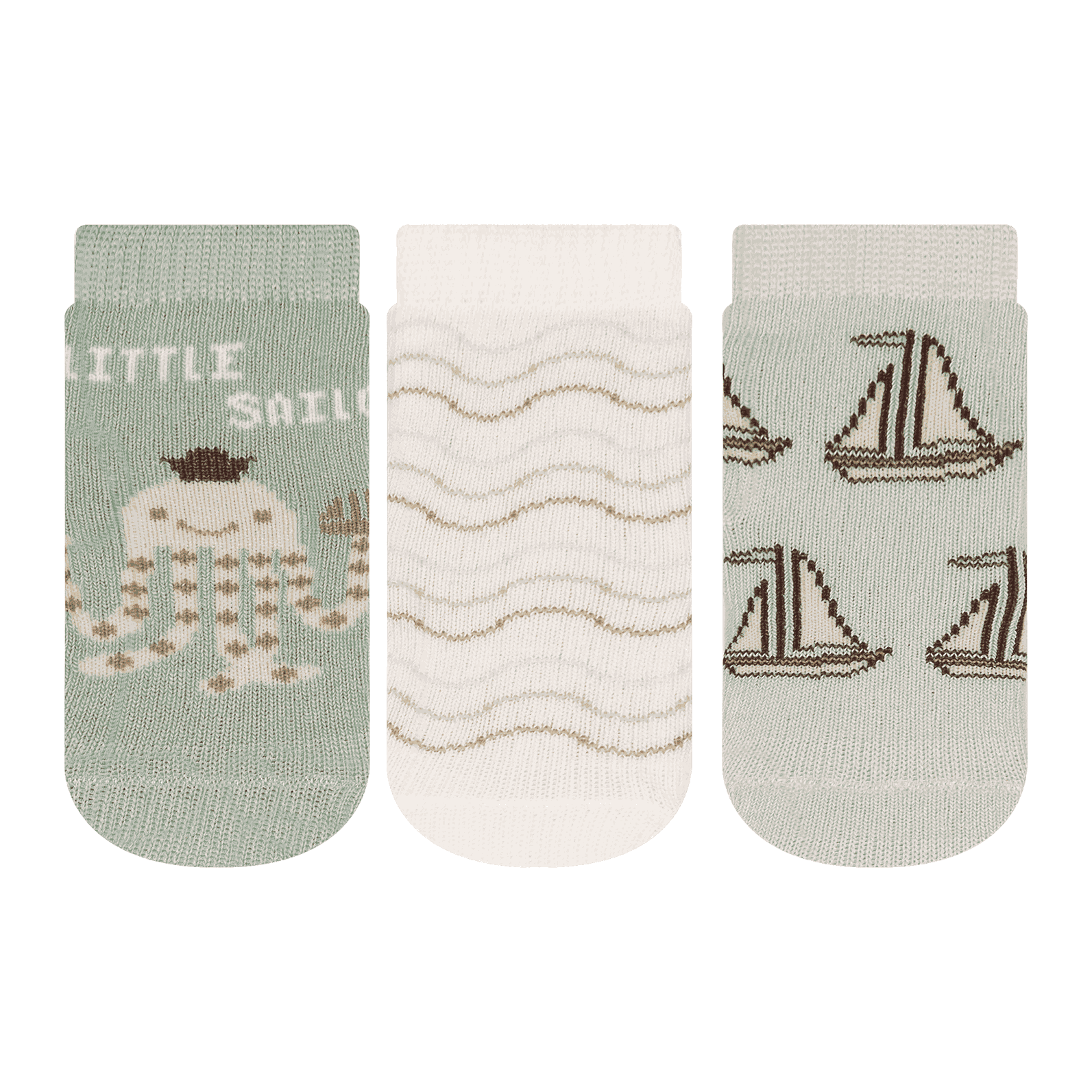 Kit composto por três pares de meias modelo soquete, confeccionadas em algodão. Elas apresentam estampas com elementos marinhos, com acabamento e costura em tons harmoniosos.