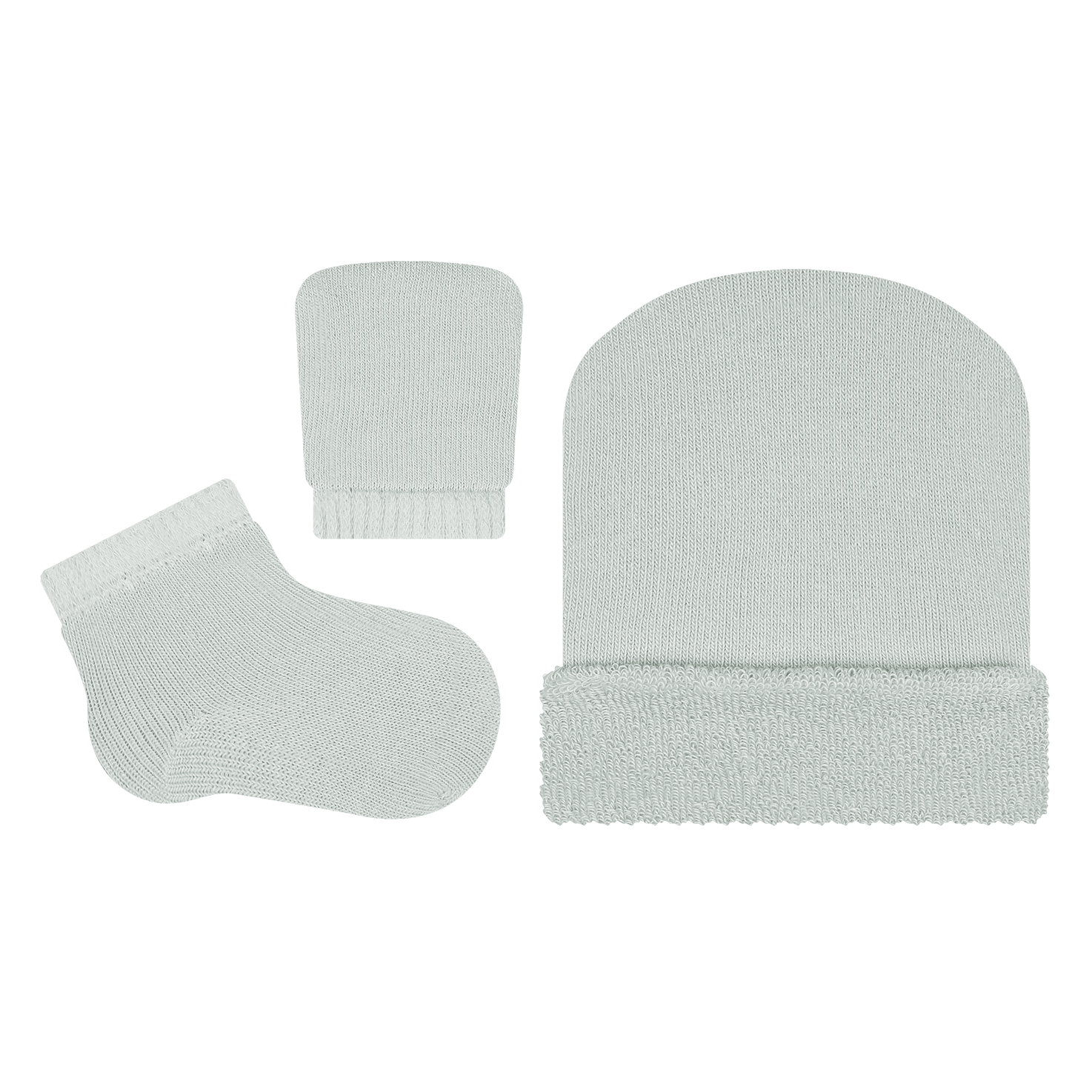 Kit recém-nascido composto por uma touca, um par de Luvas e um par de meias confeccionadas em algodão, com acabamento e costura em tons harmoniosos.