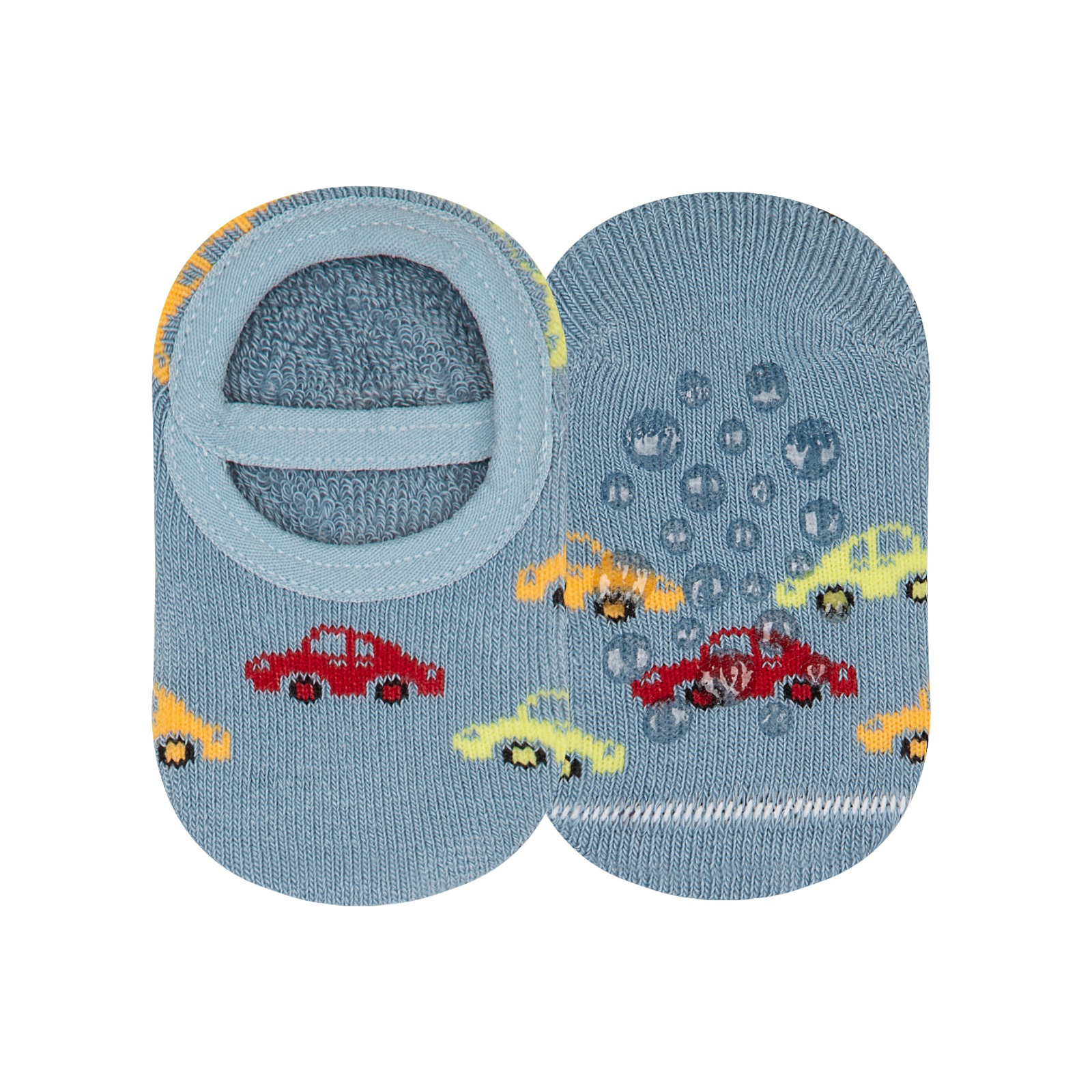Meia bebê, modelo sapatilha, confeccionada em algodão. Possui estampa divertida, tira elástica, solado antiderrapante emborrachado, acabamento e costura no tom.