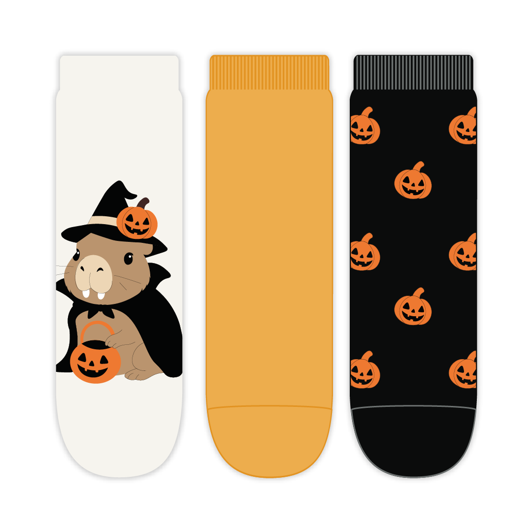 Kit composto por três pares de meias cano curto. Confeccionadas em tecido de algodão, com estampas divertidas de halloween, acabamento e costura no mesmo tom.