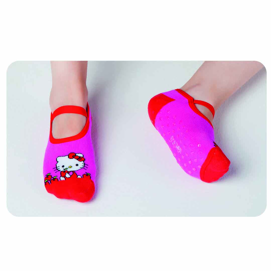 Meia modelo sapatilha com alça, confeccionadas em algodão. Possui estampas fofas da Hello Kitty, tira de elástico para melhor ajuste aos pés, e solado com antiderrapantes emborrachado que garante maior segurança e conforto ao caminhar, acabamento e costura no tom.