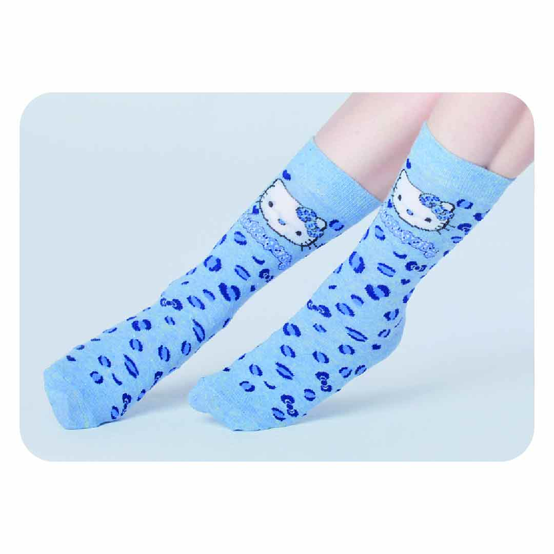 Meia modelo cano longo, confeccionadas em tecido de algodão, com estampas da Hello Kitty, acabamento e costura no mesmo tom.