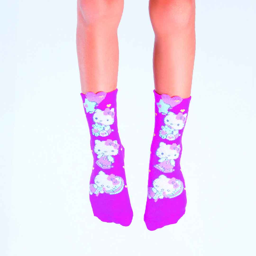 Meia modelo soquete 3D, confeccionadas em tecido de algodão. Possuem estampas fofas da Hello Kitty, com relevo no punho e costura no mesmo tom, proporcionando um look com mais estilo.