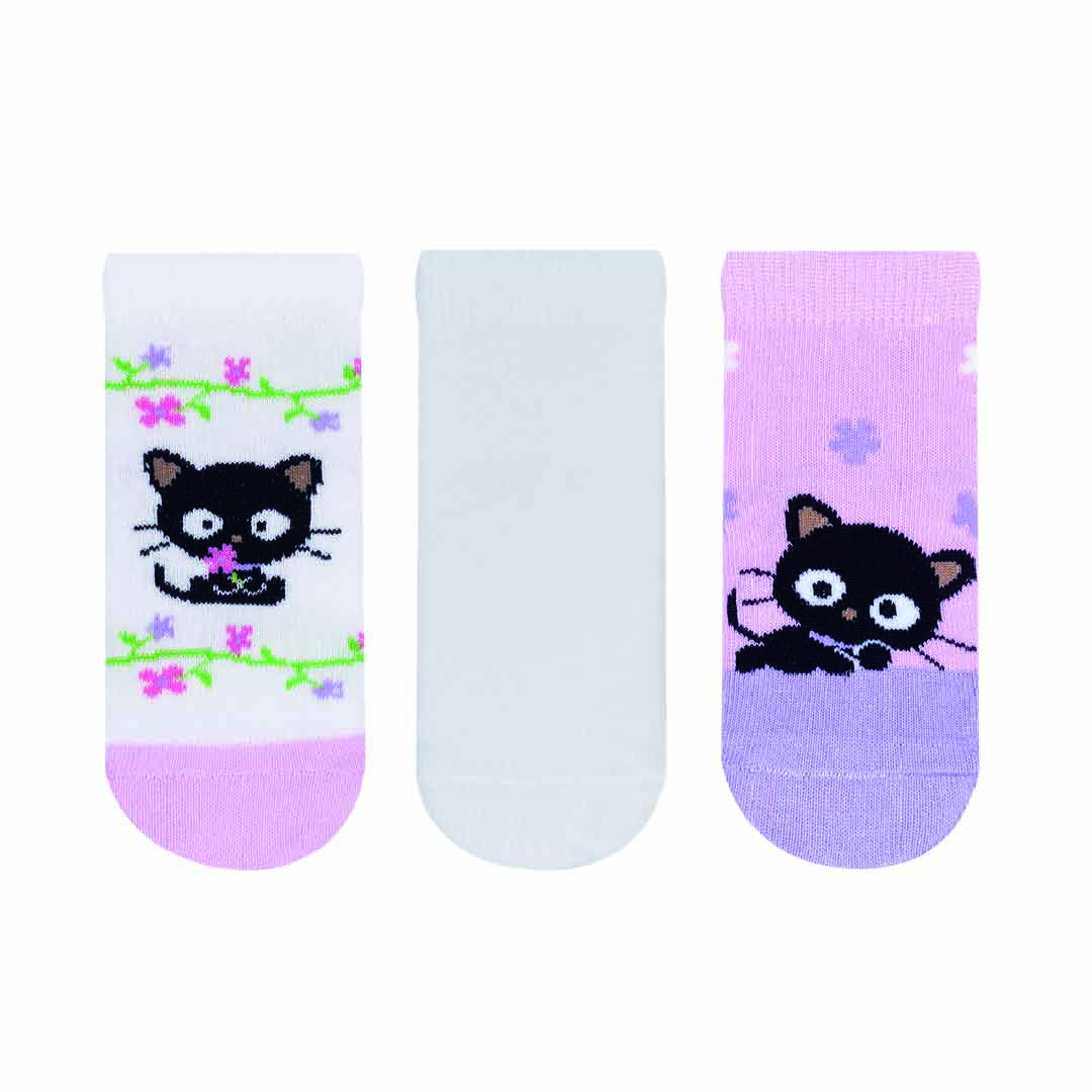 Kit composto por três pares de meias modelo soquete, confeccionadas em algodão. Elas apresentam estampas fofas do ChocoCat, com acabamento e costura em tons harmoniosos.