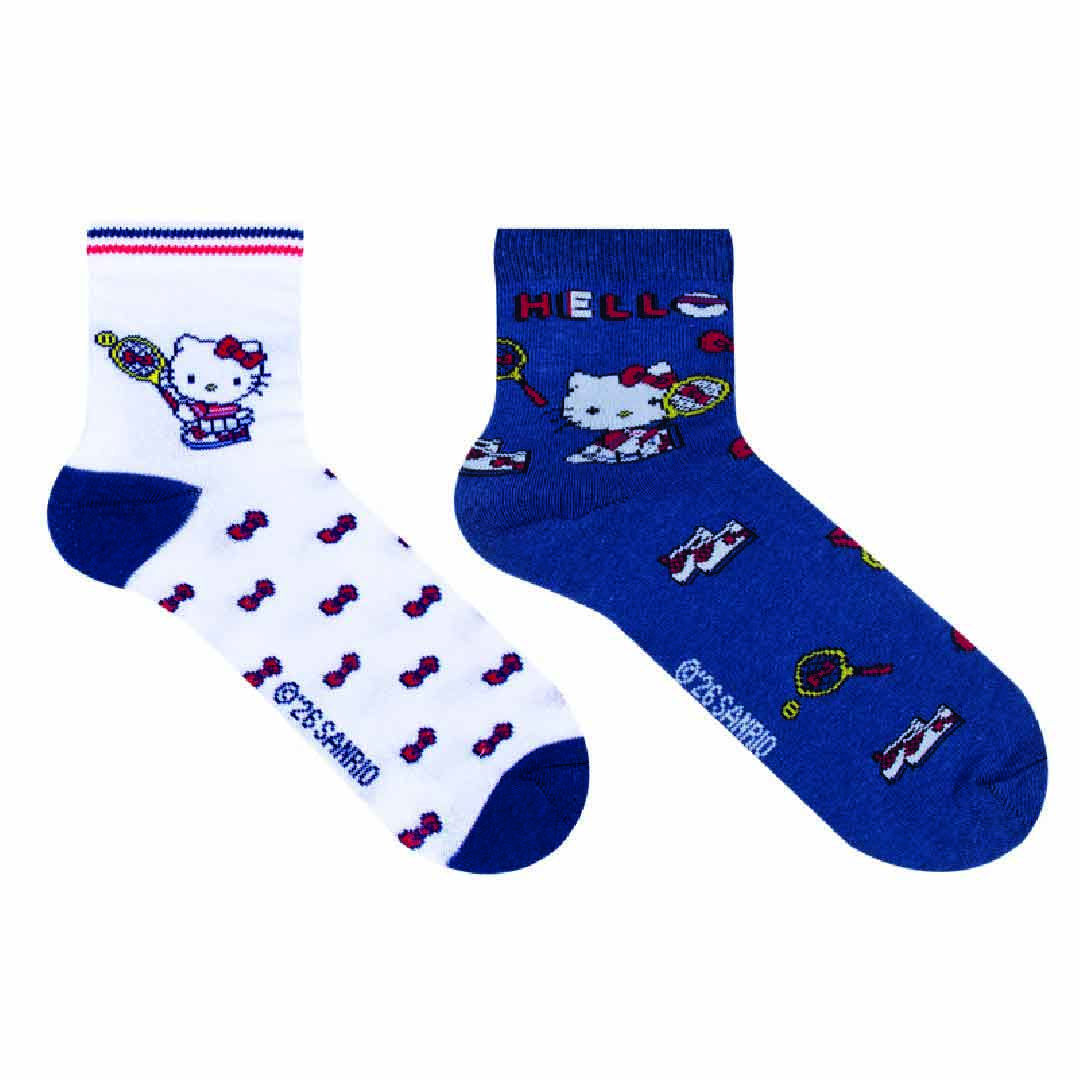 Kit composto por dois pares de meias modelo soquete, confeccionadas em tecido de algodão, com estampas fofas da Hello Kitty, acabamento e costura no mesmo tom.