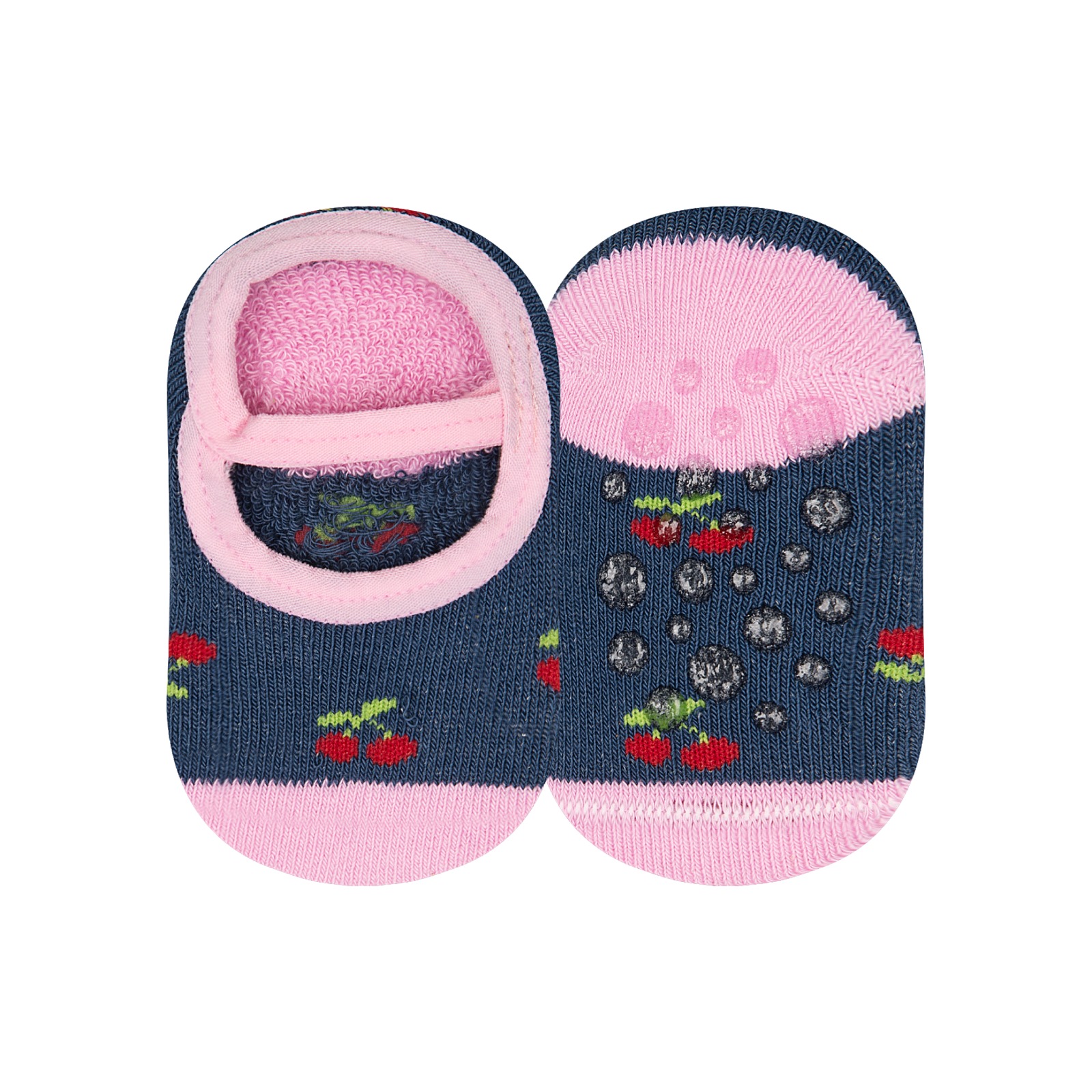 Meia bebê, modelo sapatilha, confeccionada em algodão. Possui estampa divertida, tira elástica, solado antiderrapante emborrachado, acabamento e costura no tom.