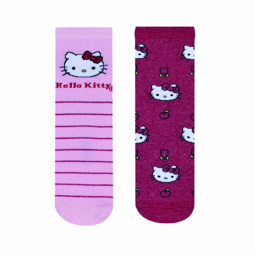 Kit composto por dois pares de meias modelo soquete, confeccionadas em tecido de algodão, com estampas fofas da Hello Kitty, acabamento e costura no mesmo tom.