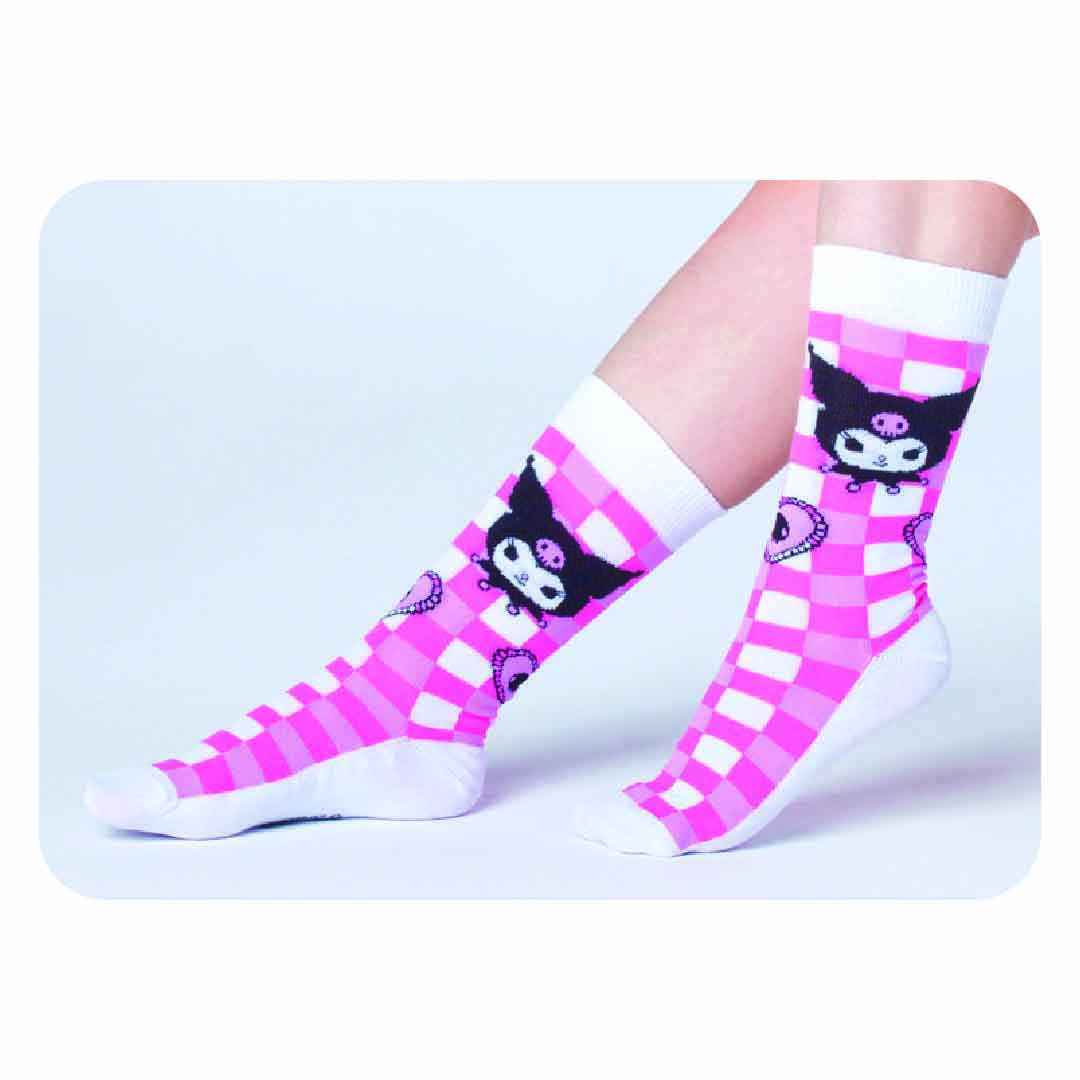 Meia modelo cano longo, confeccionadas em tecido de algodão, com estampas da Kuromi, acabamento e costura no mesmo tom.