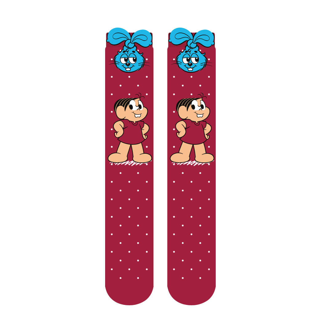 Meia modelo 3/4, confeccionadas em tecido de algodão, com estampas divertidas da turma da Mônica, com acabamento e costura no mesmo tom.