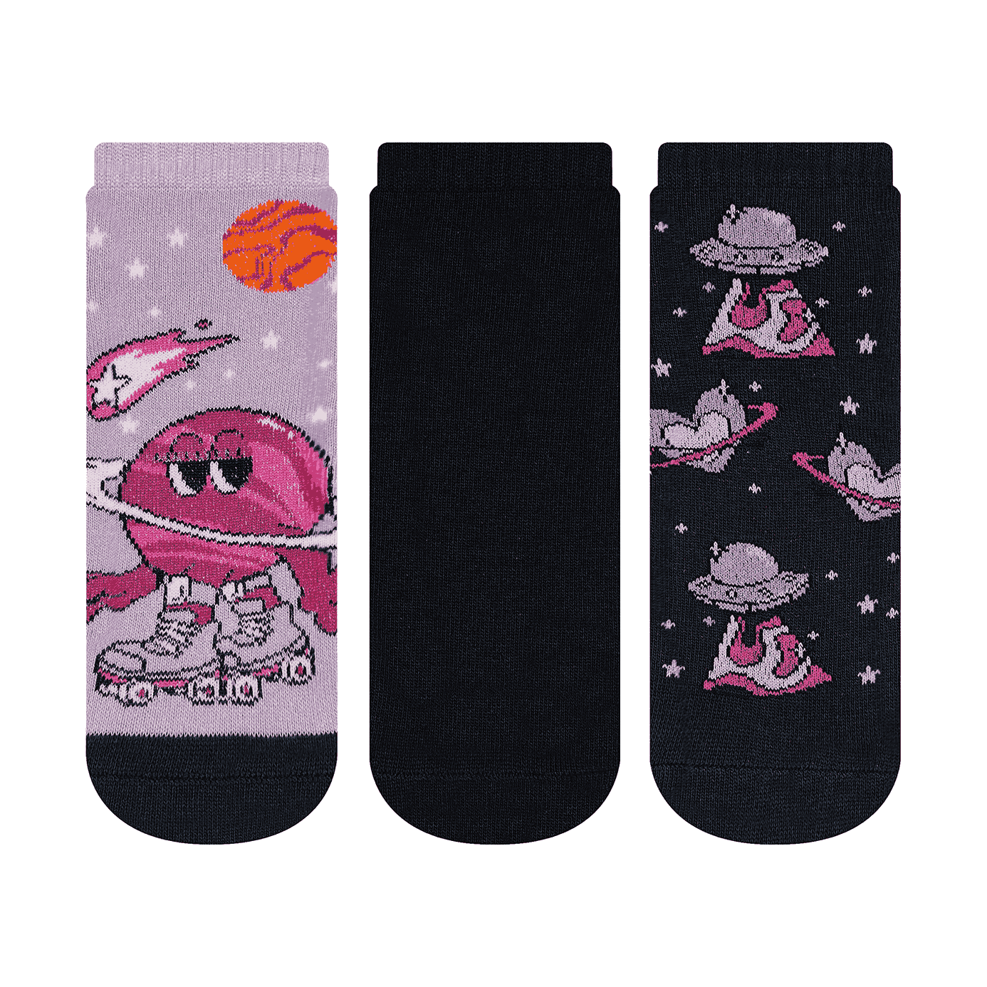 Kit composto por três pares de meias cano curto. Confeccionadas em tecido de algodão, elas apresentam estampas divertidas, com acabamento e costura no mesmo tom.