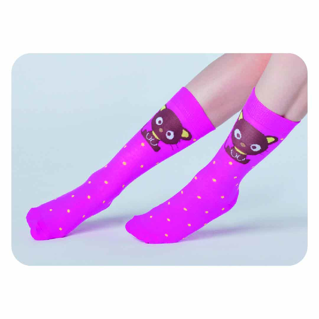 Meia modelo cano longo, confeccionadas em tecido de algodão, com estampas do ChocoCat, acabamento e costura no mesmo tom.