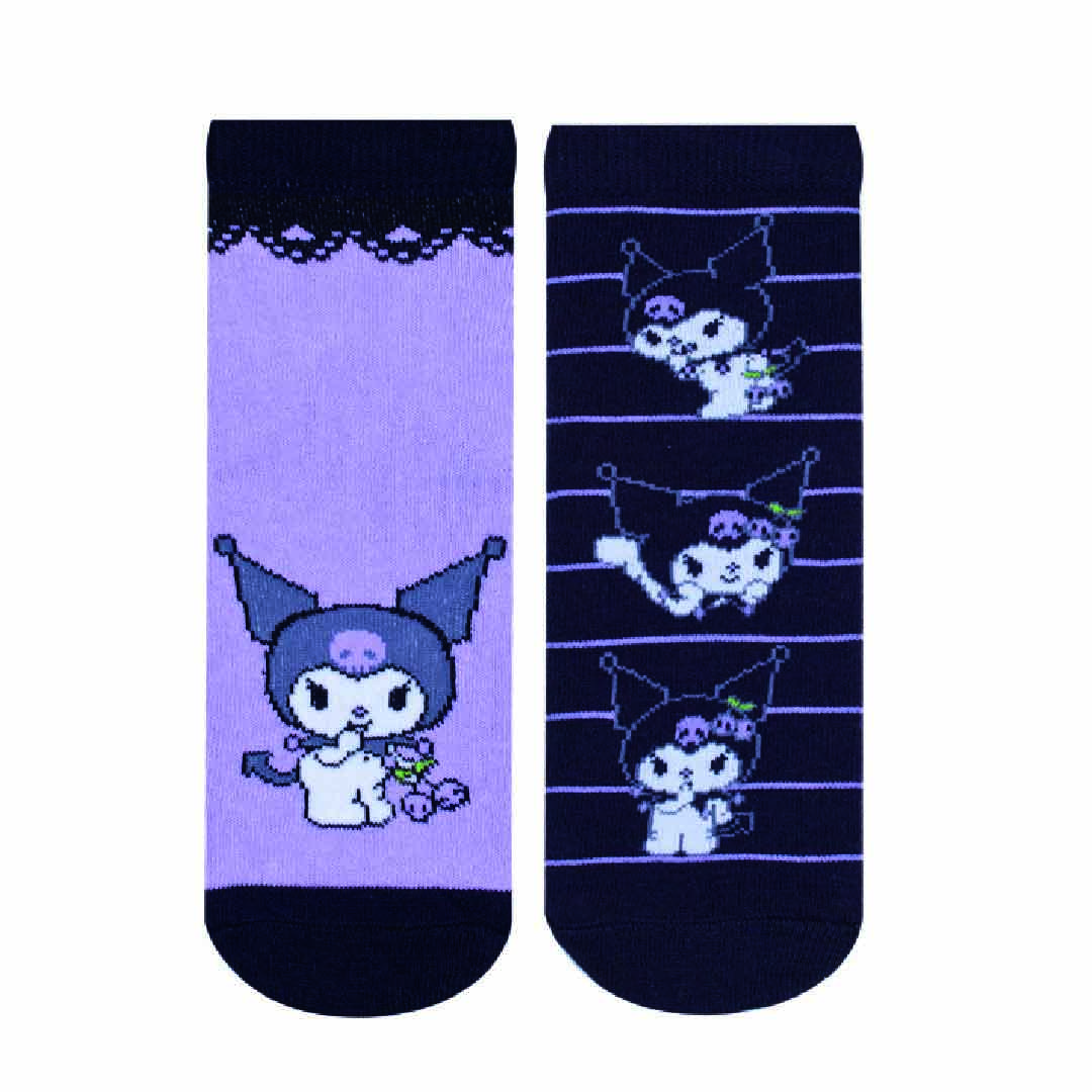 Kit composto por três pares de meias soquete. Confeccionadas em tecido de algodão, elas apresentam estampas fofas da Kuromi, com acabamento e costura no mesmo tom.