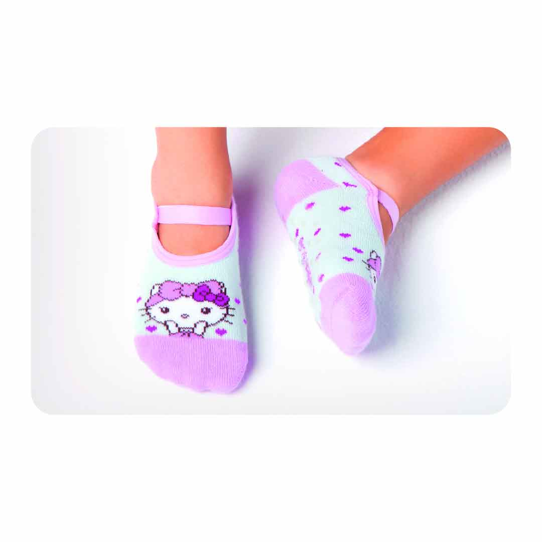 Meia modelo sapatilha com alça, confeccionadas em algodão. Possui estampas fofas da Hello Kitty, tira de elástico para melhor ajuste aos pés, e solado com antiderrapantes emborrachado que garante maior segurança e conforto ao caminhar, acabamento e costura no tom.