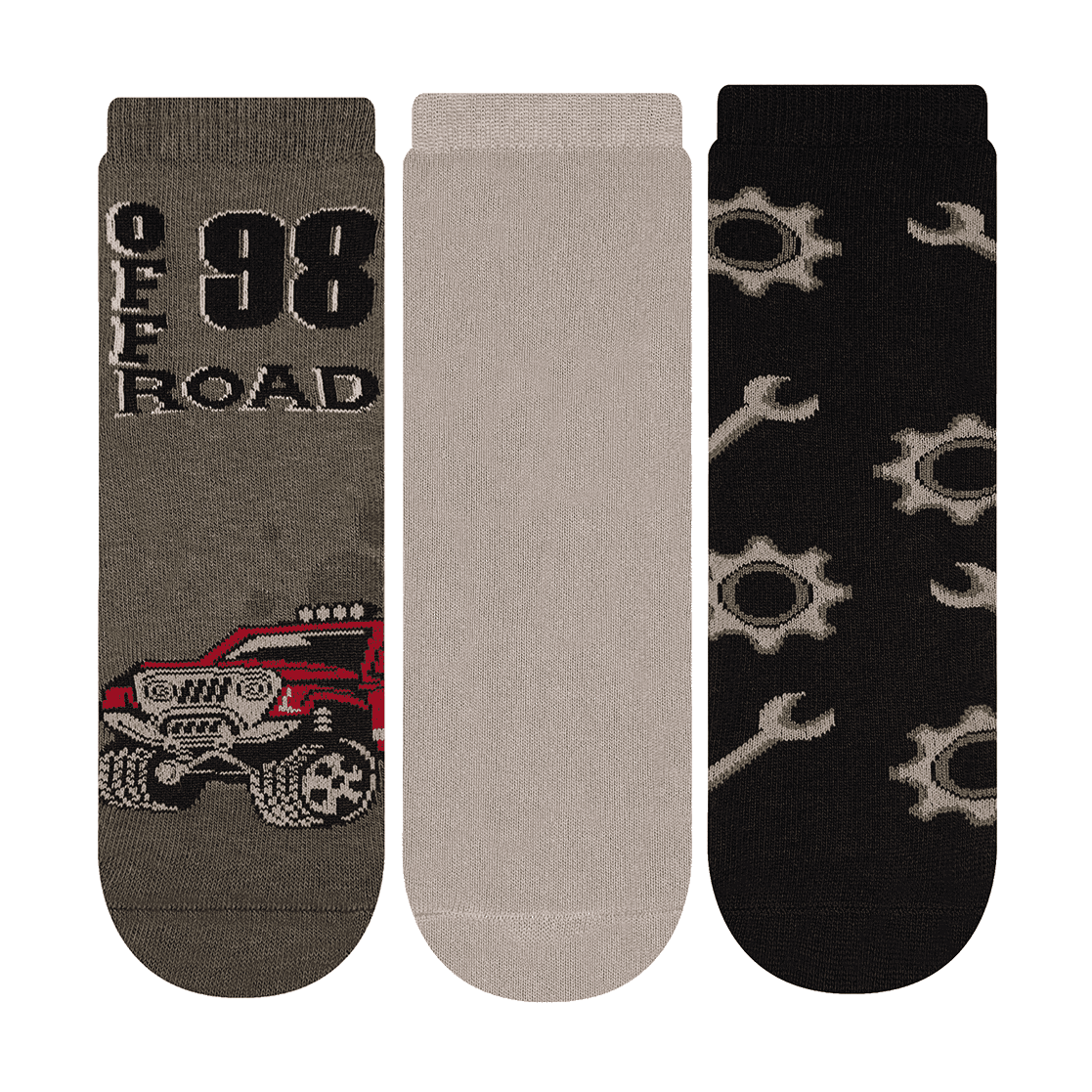 Kit composto por três pares de meias soquete. Confeccionadas em tecido de algodão, elas apresentam estampas divertidas, com acabamento e costura no mesmo tom.