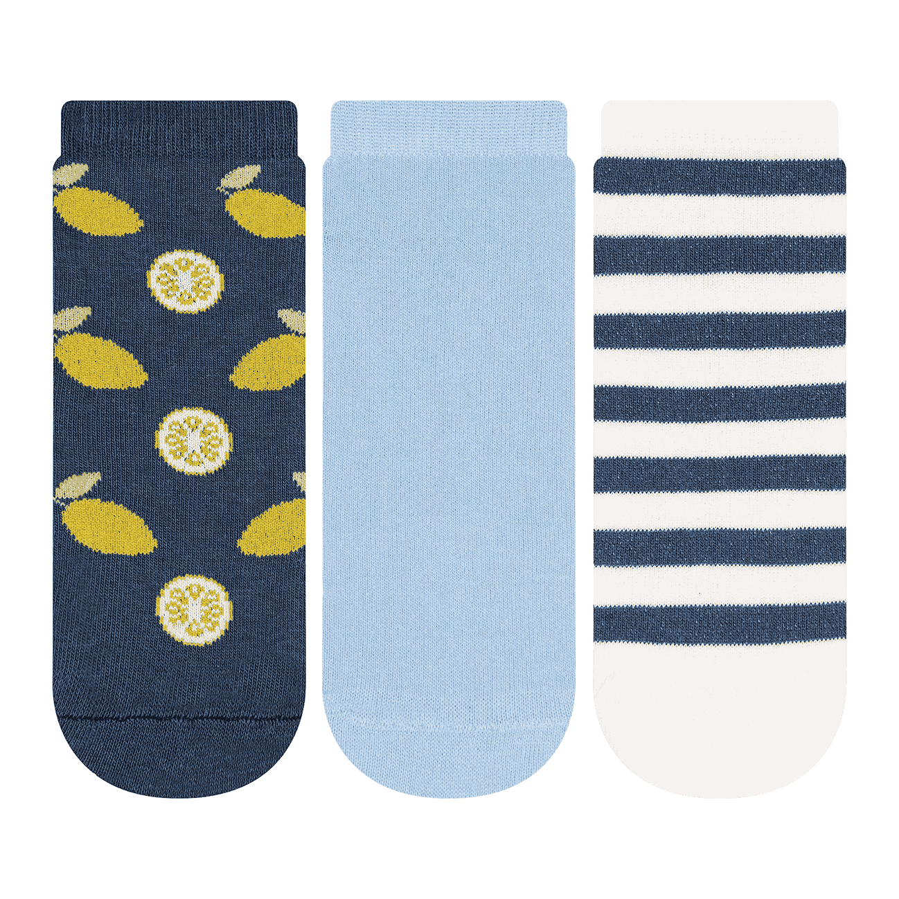 Kit composto por três pares de meias cano curto. Confeccionadas em tecido de algodão, com estampas divertidas, acabamento e costura no mesmo tom.