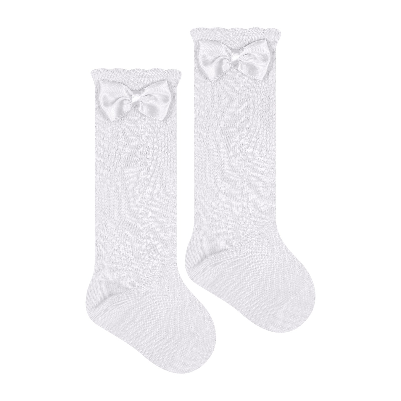 Meia bebê, modelo 3/4, confeccionada em algodão. Possui aplique de laço no cano, corpo texturizado, acabamento e costura no tom.