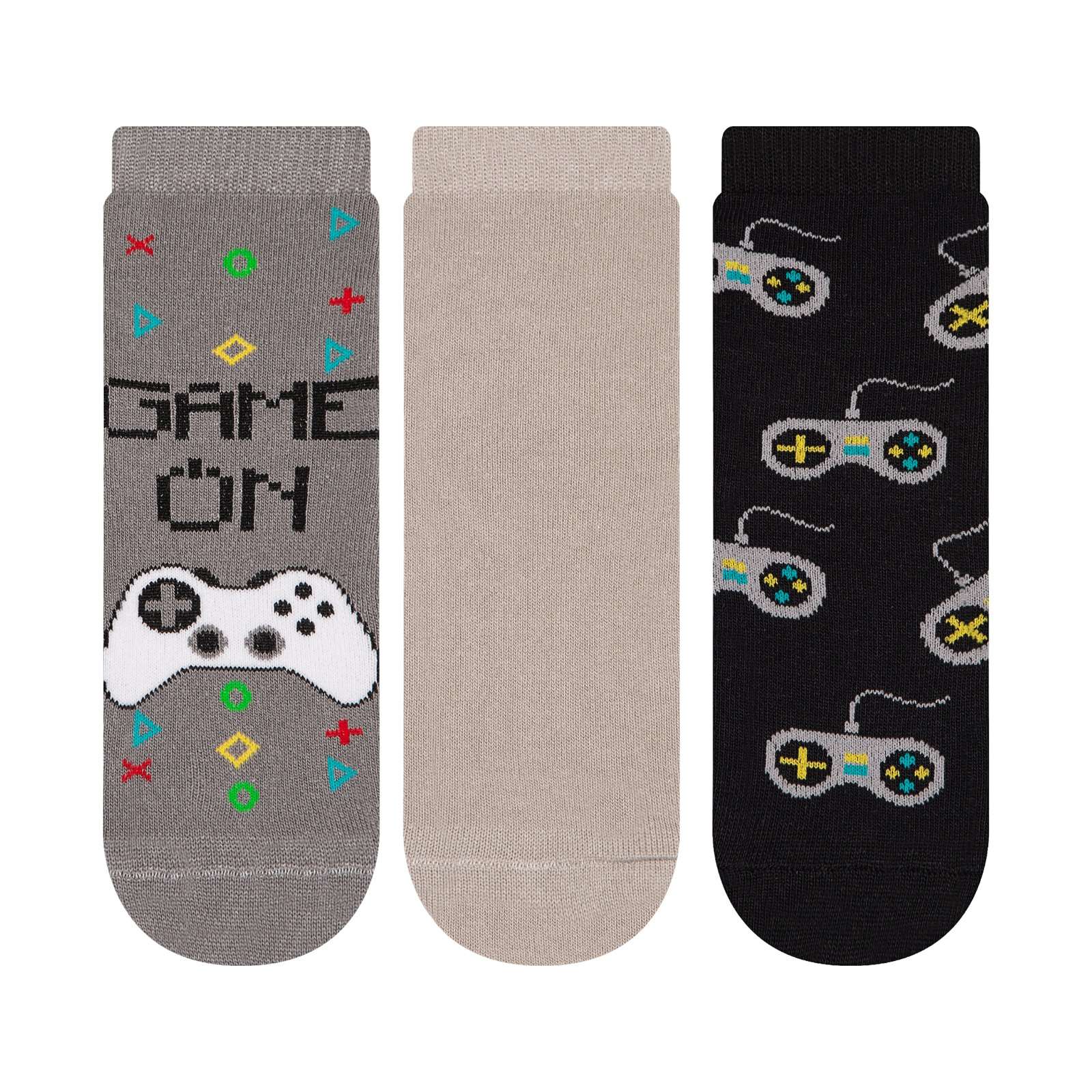 Kit composto por três pares de meias soquete. Confeccionadas em tecido de algodão, elas apresentam estampas divertidas, com acabamento e costura no mesmo tom.