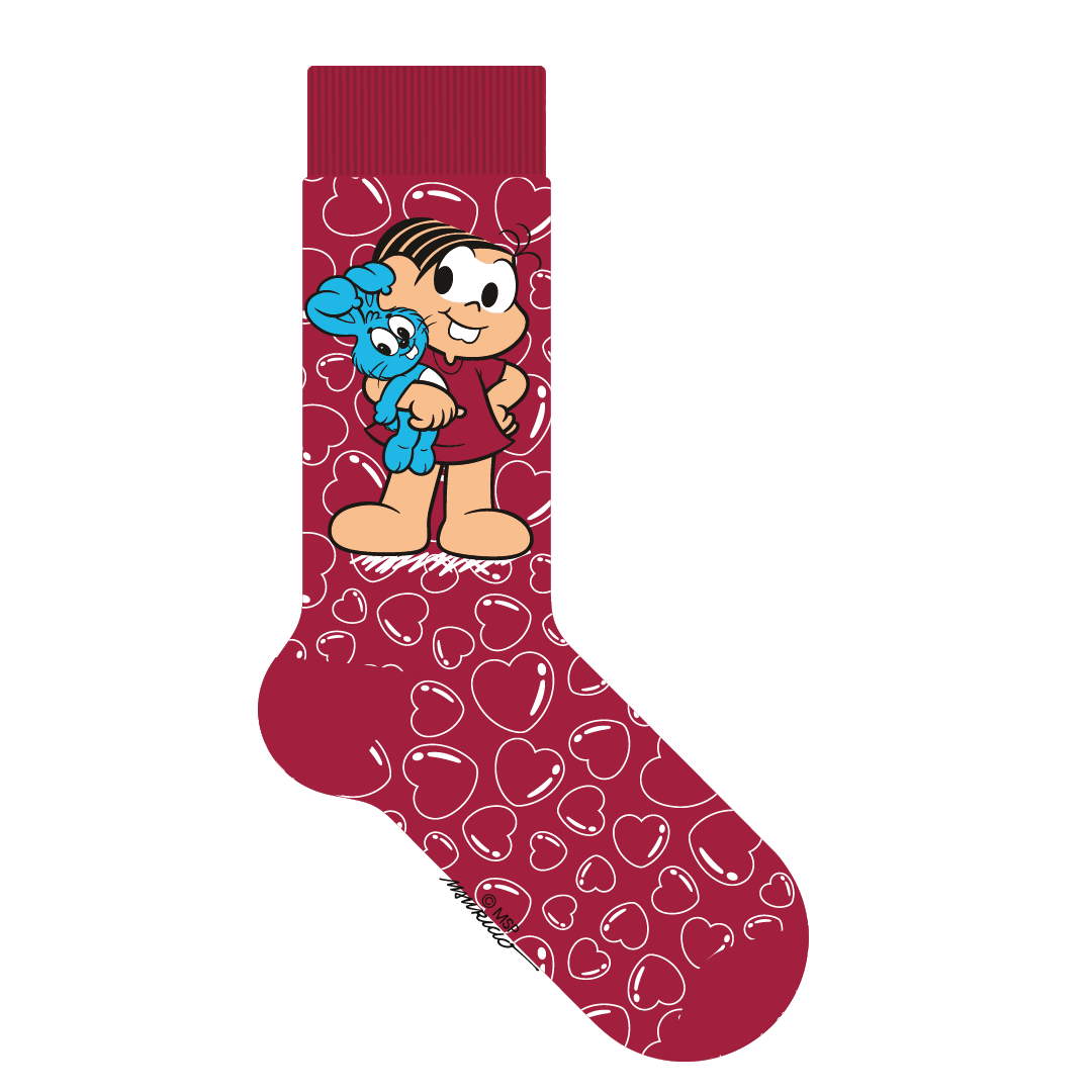 Meia modelo cano longo, confeccionadas em tecido de algodão, com estampas da Turma da Mônica, acabamento e costura no mesmo tom.
