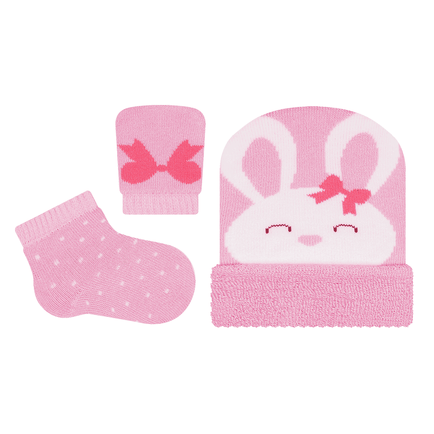 Kit recém-nascido composto por uma touca, um par de Luvas e um par de meias confeccionadas em algodão. Com acabamento e costura em tons harmoniosos e estampas divertidas.