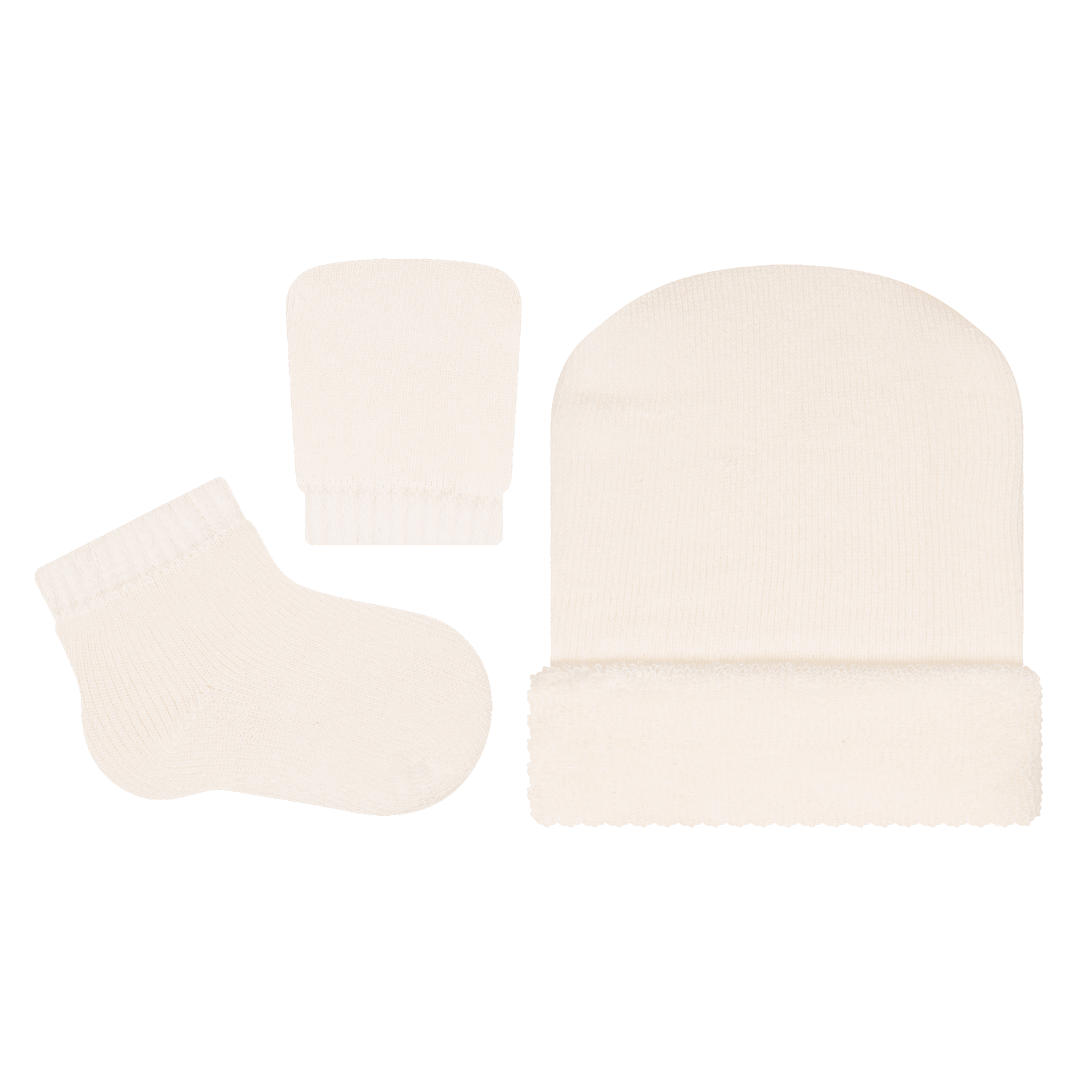 Kit recém-nascido composto por uma touca, um par de Luvas e um par de meias confeccionadas em algodão. Com acabamento e costura em tons harmoniosos e estampas divertidas.