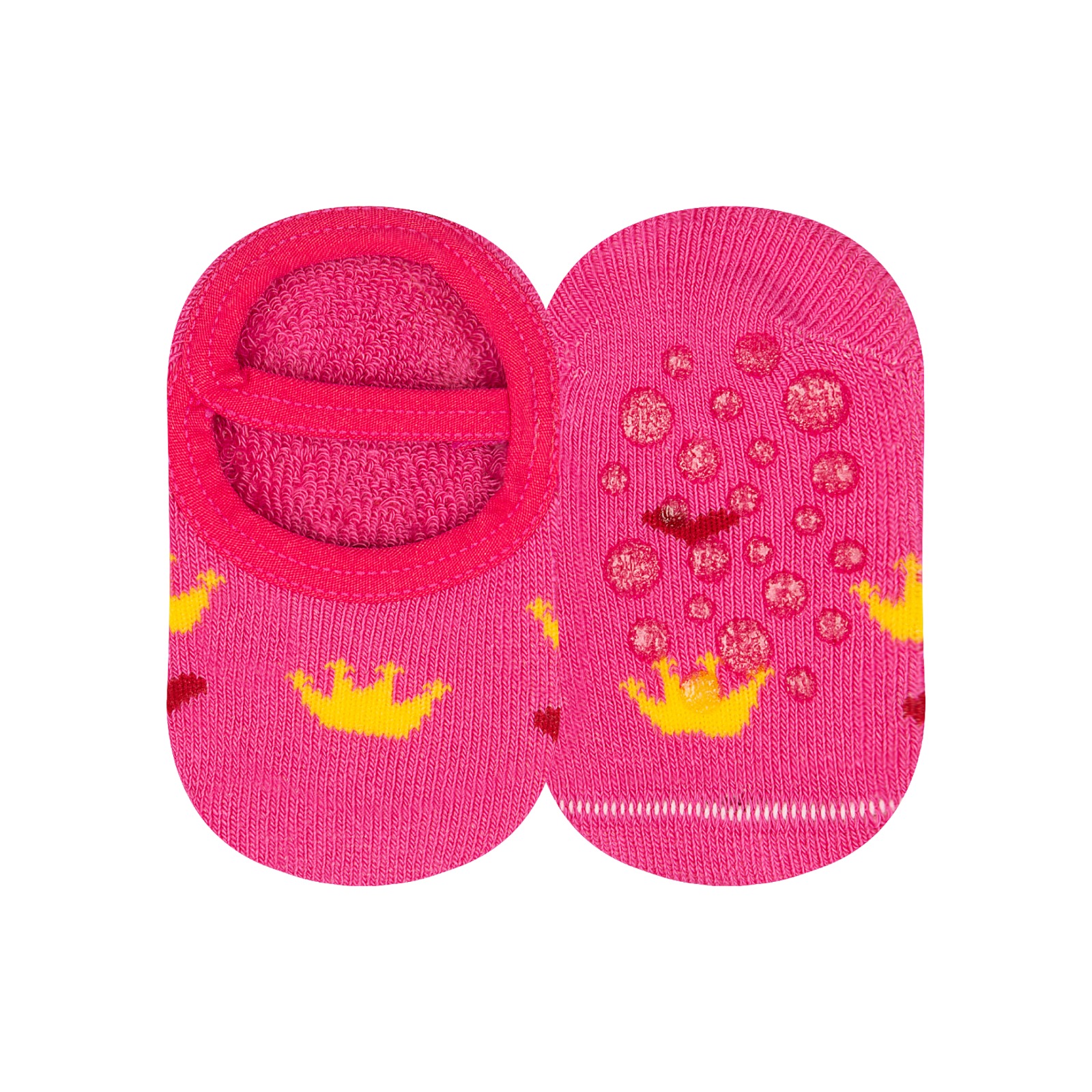 Meia bebê, modelo sapatilha, confeccionada em algodão. Possui estampa divertida, tira elástica, solado antiderrapante emborrachado, acabamento e costura no tom.