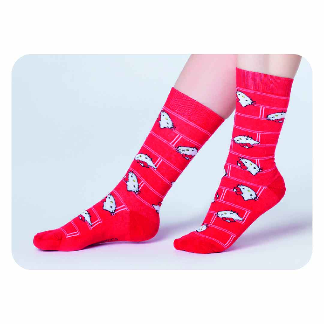 Meia modelo cano longo, confeccionadas em tecido de algodão, com estampas da Hello Kitty, acabamento e costura no mesmo tom.