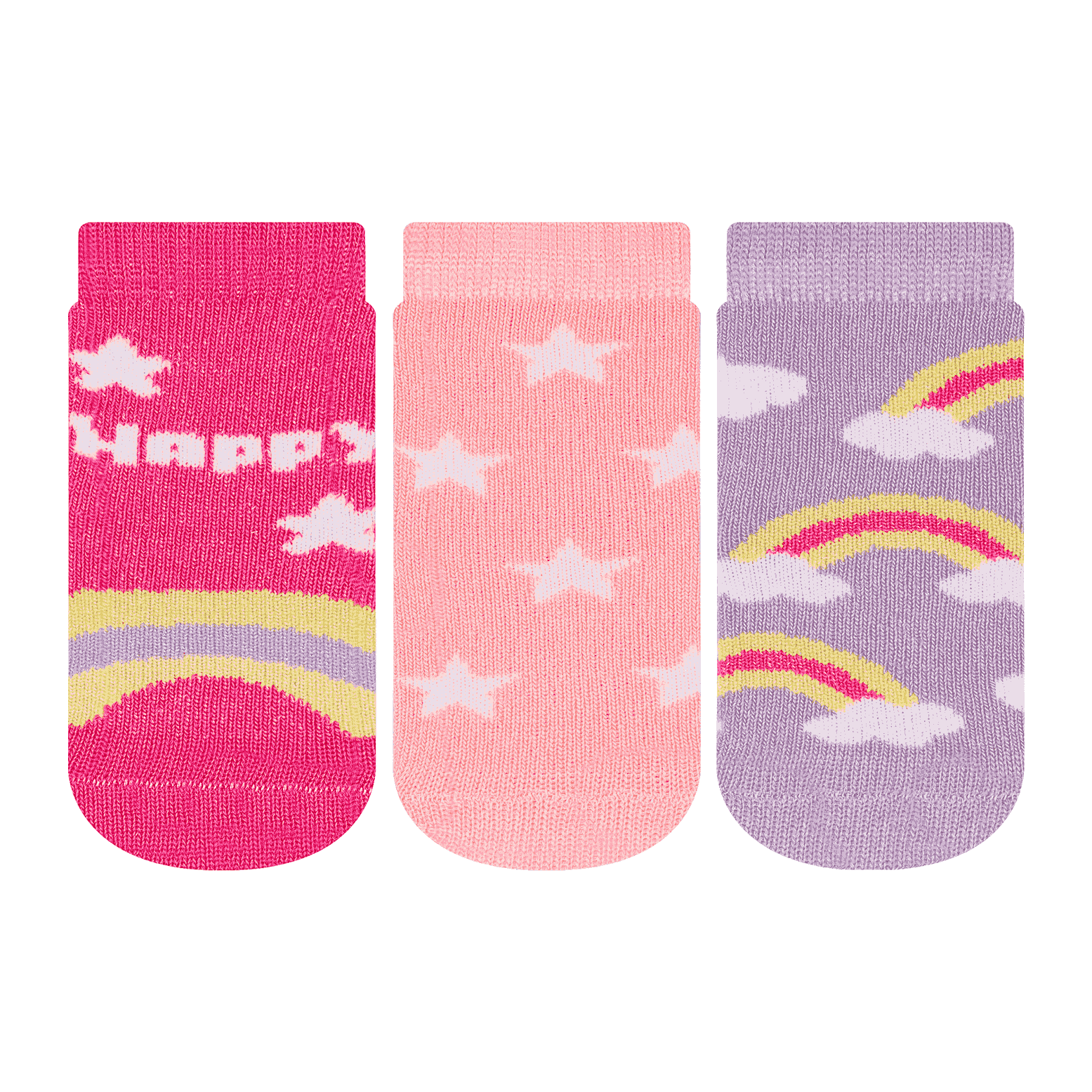 Kit composto por três pares de meias modelo soquete, confeccionadas em algodão. Elas apresentam estampas de estrelinhas e arcoíris, com acabamento e costura em tons harmoniosos