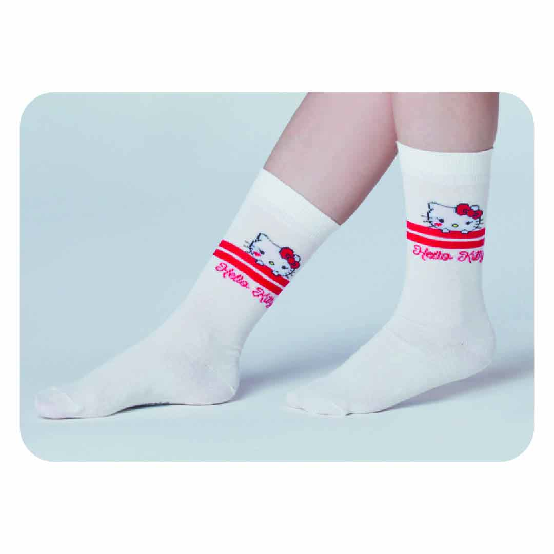 Meia modelo cano longo, confeccionadas em tecido de algodão, com estampas da Hello Kitty, acabamento e costura no mesmo tom.