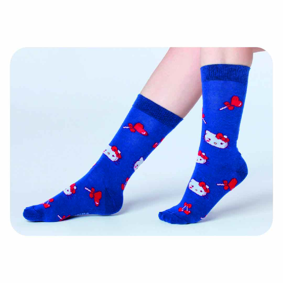 Meia modelo cano longo, confeccionadas em tecido de algodão, com estampas da Hello Kitty, acabamento e costura no mesmo tom.