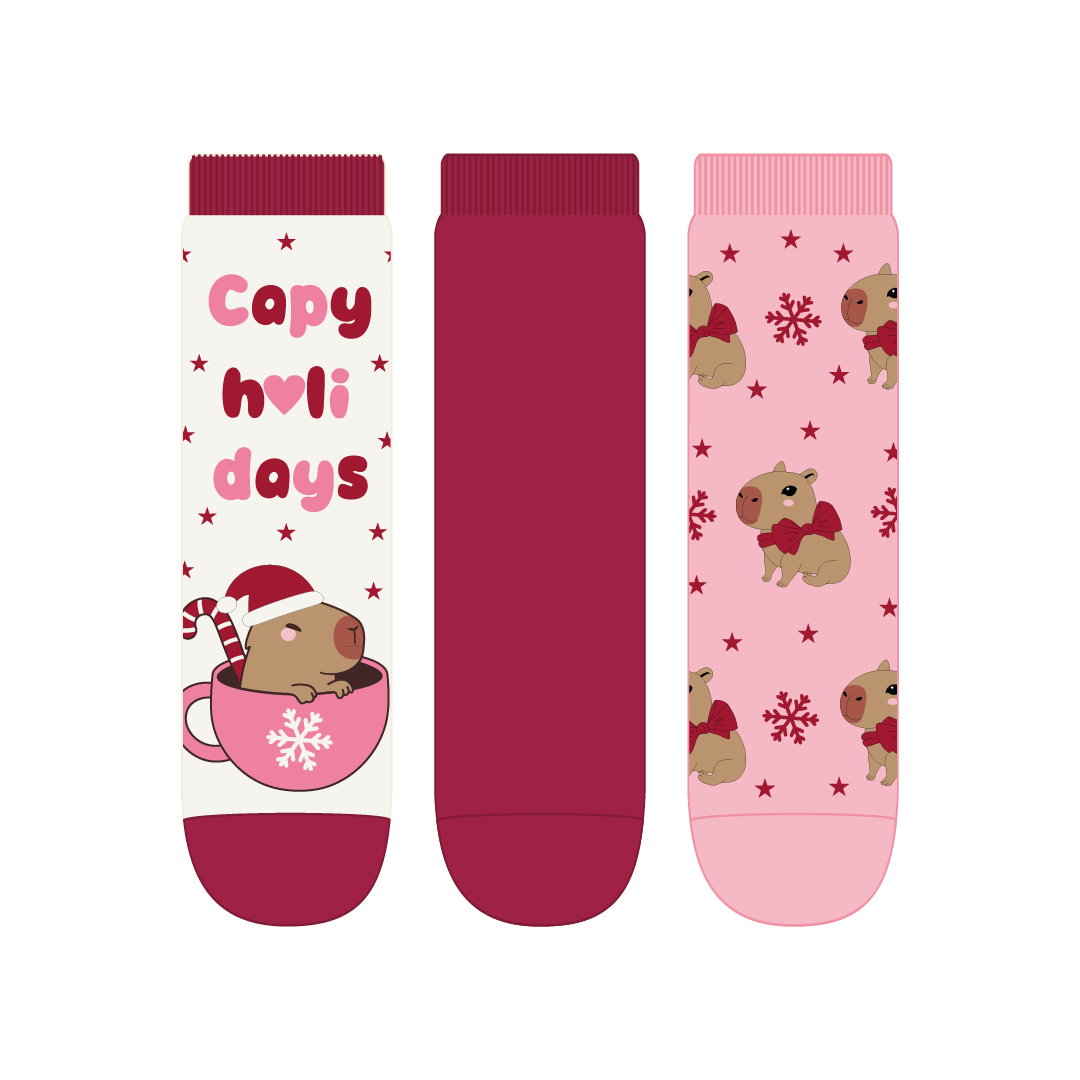 Kit composto por três pares de meias soquete. Confeccionadas em tecido de algodão, elas apresentam estampas divertidas de capivaras com o tema Natalino, com acabamento e costura no mesmo tom.