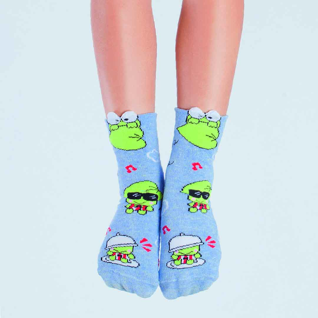 Meia modelo soquete 3D, confeccionadas em tecido de algodão. Possuem estampas fofas do Keroppi, com relevo no punho e costura no mesmo tom, proporcionando um look com mais estilo.
